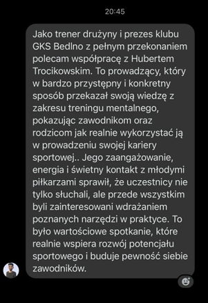 Działa błyskawicznie – bo nie buduję teorii. Daję narzędzia, które zawodnik rozumie i wdraża od razu. Często już po jednej sesji wraca na boisko z lżejszą głową i lepszym wynikiem.